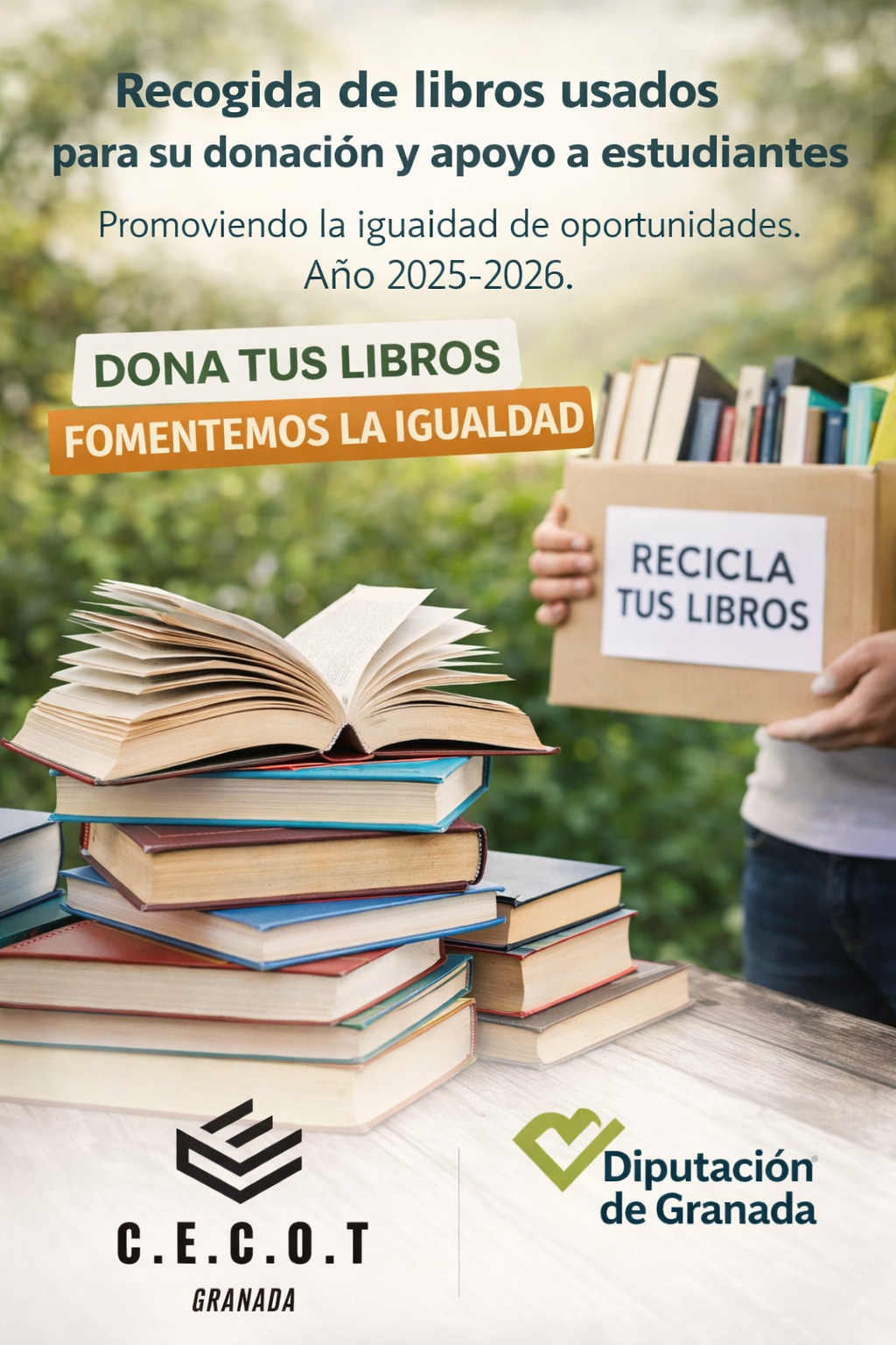 Donación de libros. Campaña de recogida de libros usados por CECOT Granada, para su donación y lectura de personas con menos recursos. Por la igualdad de todas las personas en Granada